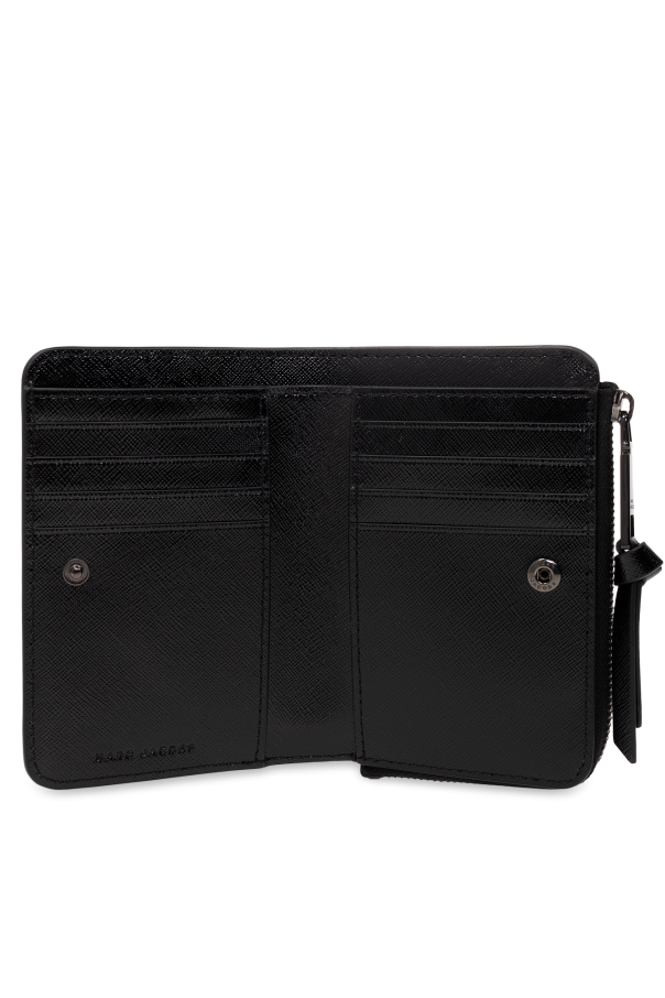 Black wallet from Marc Jacobs. Made from Saffiano leather, this design secures with a zip and snap and showcases a black metal logo plaque. It is complete with a slip pocket on the front, black metal applications as well as six card slots and two slip pockets inside.