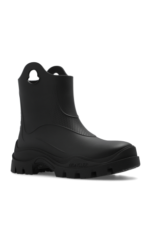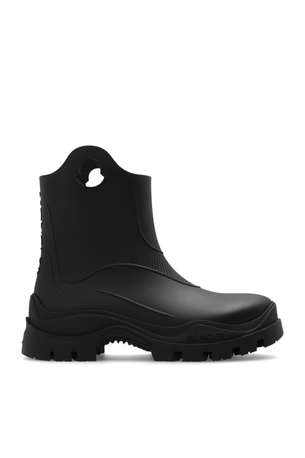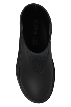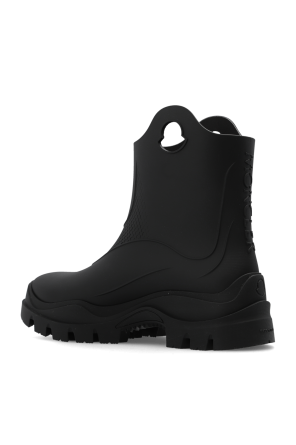 Black 'Misty' rain boots from Moncler. Sitting on a black rubber sole, this model showcases a raised logo on the side.