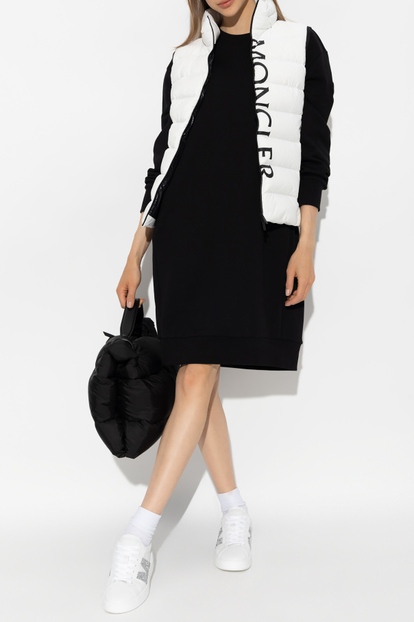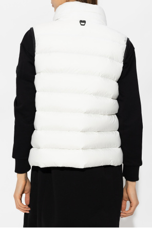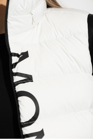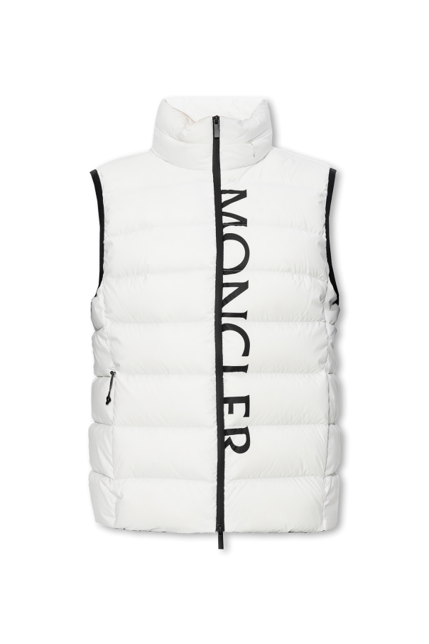 White and black ‘Cenis’ down vest from Moncler. Fastened with a two-way zip, this design features a black logo print, two zipped front pockets and hidden hood.