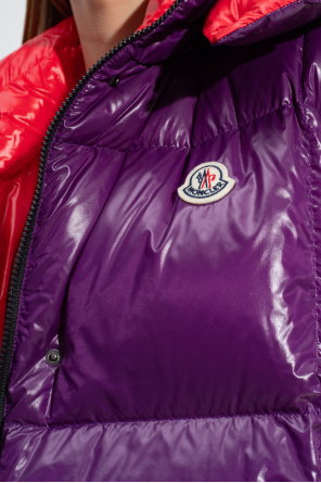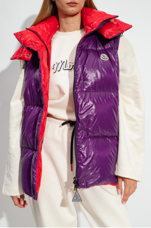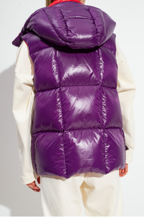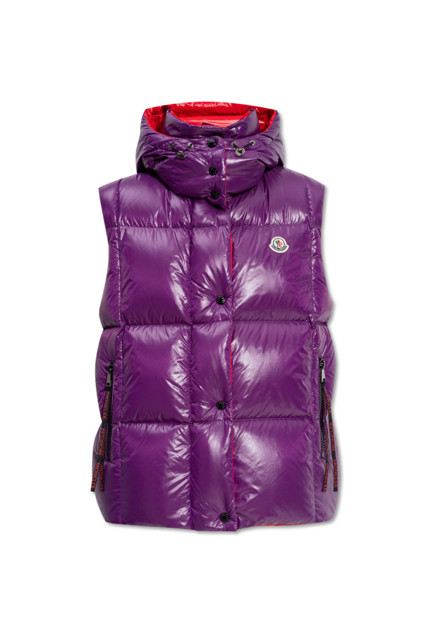 Purple 'Luzule' down vest from Moncler. Crafted from glossy nylon, this style fastens with a two-way zipper and snaps and features a detachable drawstring hood, two front zip pockets and a logo patch for brand recognition.