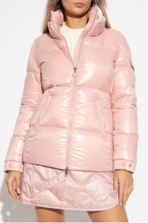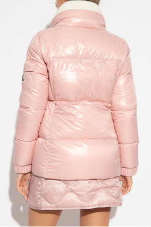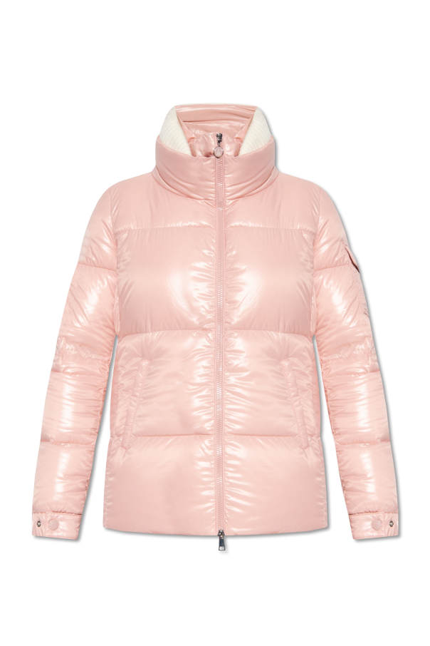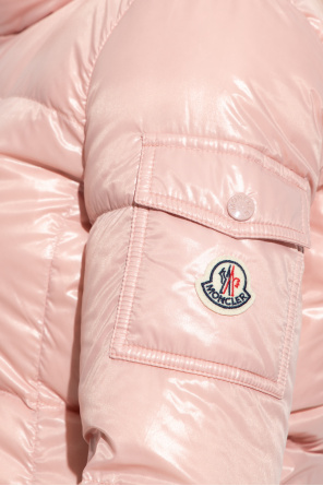 Light pink ‘Vistule’ quilted down jacket from Moncler. Emblazoned with a felt patch on the shoulder, this style fastens with a two-way zip and features a detachable wool collar, one flapped pocket with a snap on the sleeve, two zip pockets and long sleeves with elasticated cuffs.