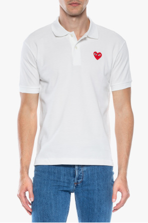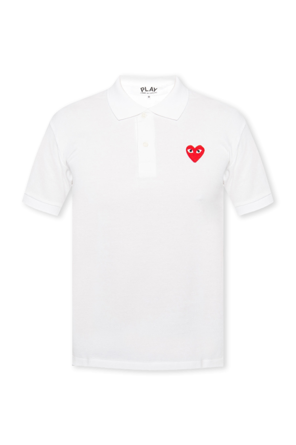 Comme Des Garçons Play的白色马球衫。棉质材料制成。附纽扣。正面饰有红色,白色和黑色的logo贴片。短袖。
