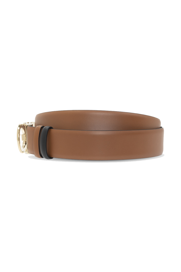 Salvatore Ferragamo 的棕色和黑色腰带。 这款单品采用小牛皮制成,配有金色徽标雕刻搭扣。