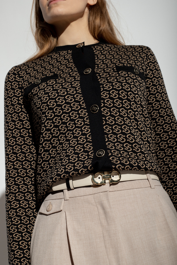 Salvatore Ferragamo的黑色和奶油色双面腰带,采用小牛皮制成,饰有金色金属质感的“Gancini”搭扣。