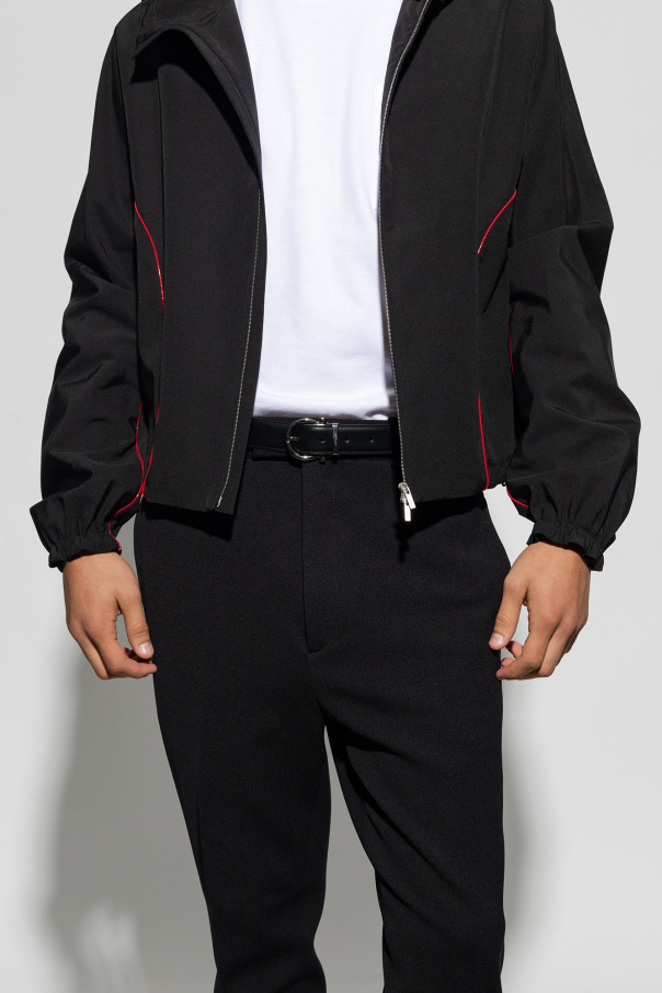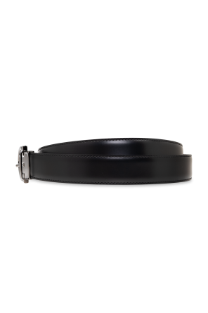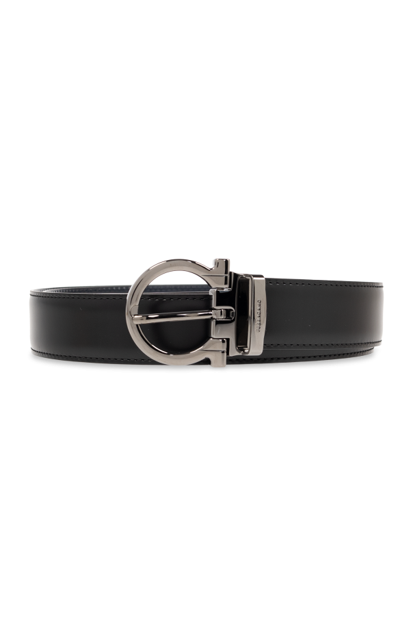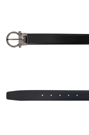 FERRAGAMO 黑色和海军蓝色双面腰带,采用光滑皮革制成,配有深灰色徽标形金属搭扣。