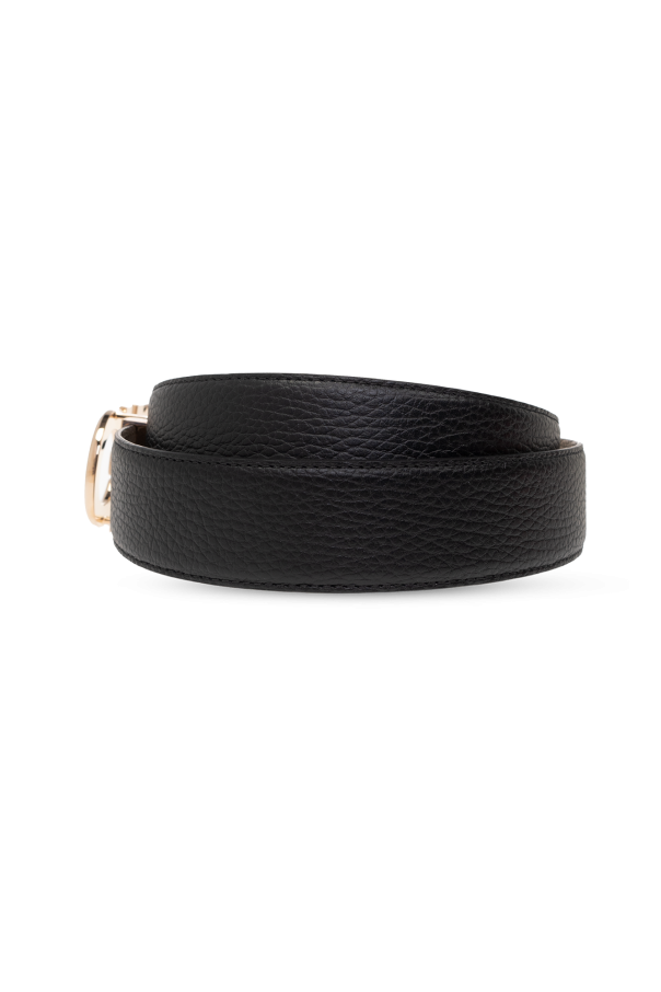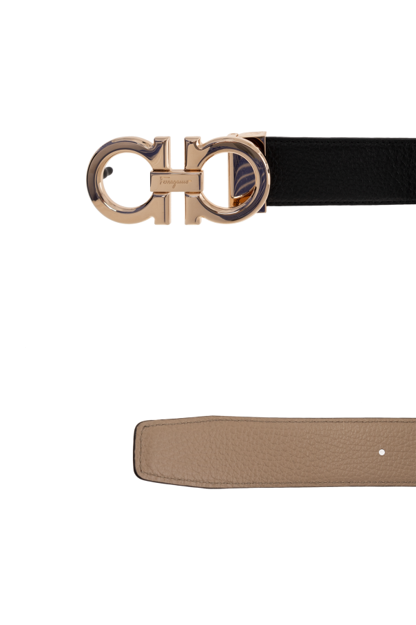 FERRAGAMO的黑色和米色双面腰带。采用纹理小牛皮制成,饰有品牌标志形状的金色搭扣。