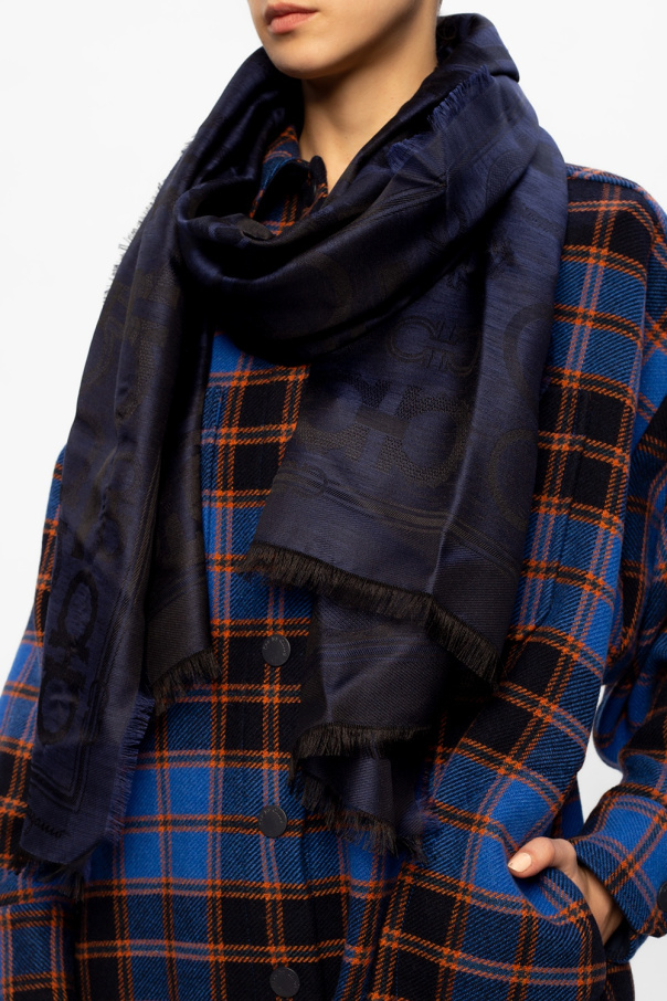 Salvatore Ferragamo的深蓝色及黑色围巾。羊绒及丝绸制成。附品牌logo。饰有毛边。