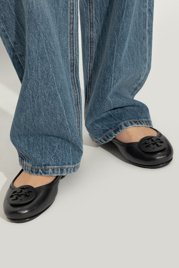 Tory Burch的黑色真皮平跟鞋,饰以logo贴饰。黑色橡胶鞋底。