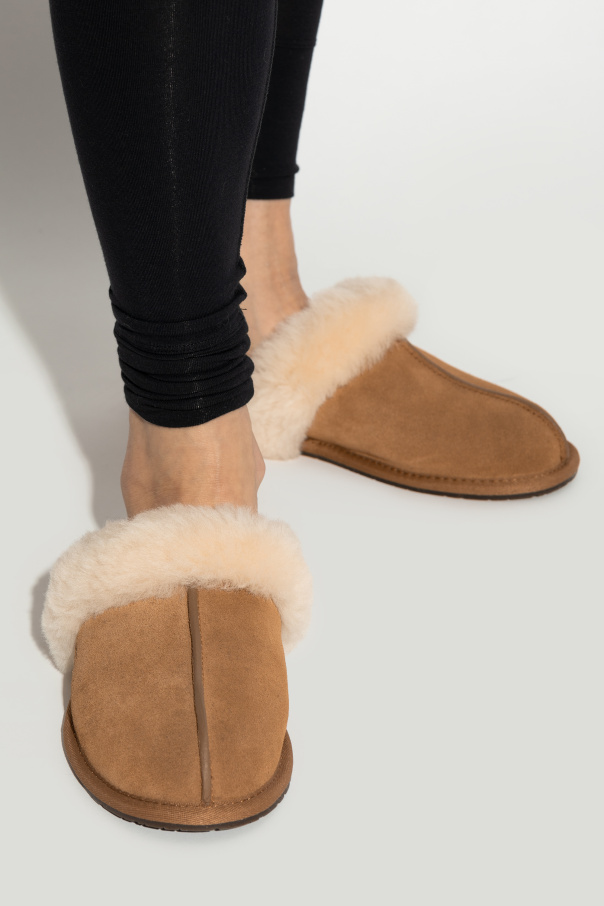 Brown and cream ‘Scuffette II’ slippers from UGG. Made of sheep suede, this pair features an embossed logo in black, a brown rubber sole and shearling trims.