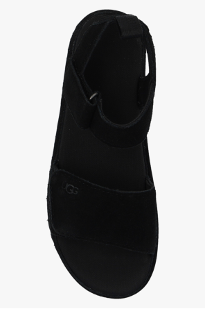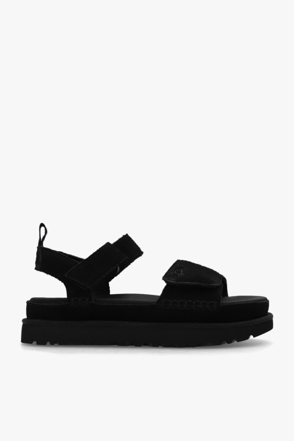 Black ‘Goldenstar’ platform sandals from UGG. Made of suede, this pair features velcro straps, embossed logo on the side as well as a black rubber and EVA SugarSole™.