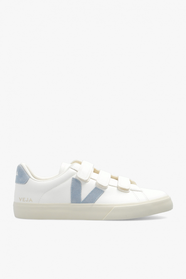 White 'Recife' sneakers from Veja. Crafted from chrome-free leather, this model features an embossed logo on the tongue, a triple velcro closure, organic cotton shoelaces and the brand's signature light blue logo patch in rubber and rice waste. The mesh inner lining made from recycled materials was developed to acquire a better resistance to friction. The organic-sourced and recycled insole consists of sugar cane, Amazon rubber, organic cotton and recycled EVA. It is set on a cream rubber sole made from organic and recycled materials. This leather undergoes an innovative tanning process where no chrome, heavy metals or dangerous acids are involved. By simplifying the tanning process, the use of chemicals and energy is limited, the use of water is reduced by about 40% and the use of salt by 80%. After tanning, the water is recyclable.