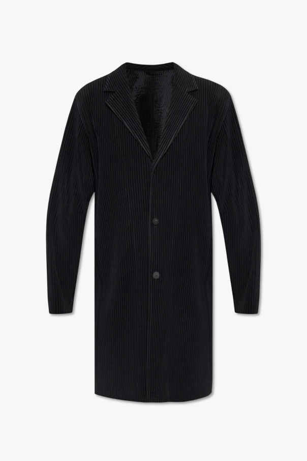 Black coat from Issey Miyake Homme Plisse. Distinguished by the brand's signature pleating technique, this style fastens with buttons and features notch lapels, two slip pockets, long sleeves with button cuffs and a single back vent.