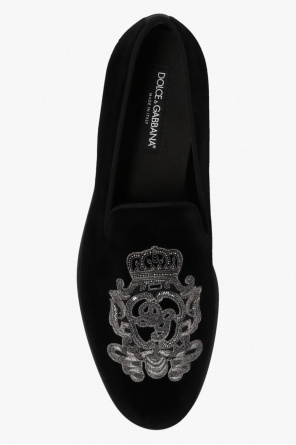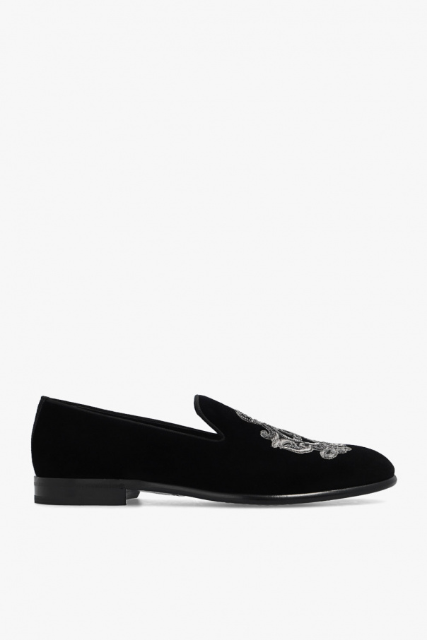 Dolce & Gabbana的黑色乐福鞋,采用天鹅绒制成,饰有装饰性徽标刺绣、闪亮贴花和黑色皮革鞋底。
