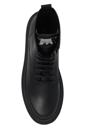 Black combat boots from Dolce & Gabbana. Made of calf leather, this lace-up pair features a logo-embossed insert in silver-tone metal on the tongue and black rubber sole with an embossed geometric pattern.
