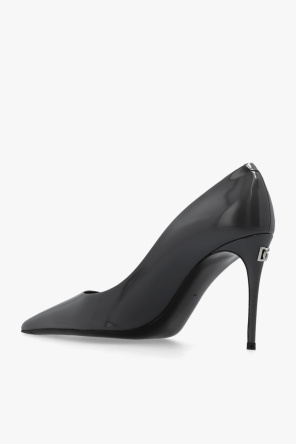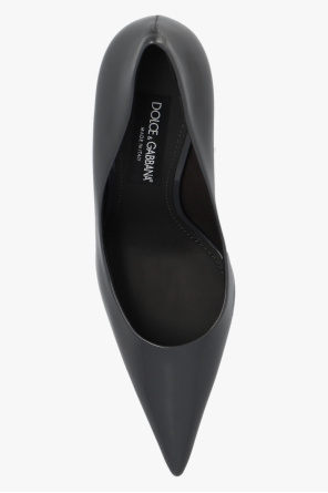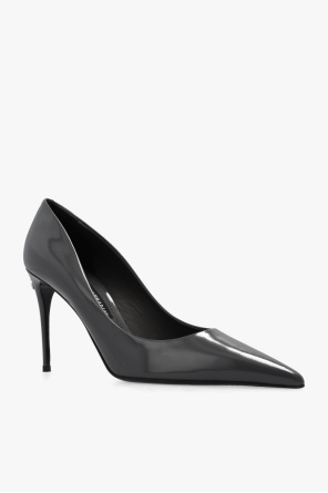 Dark grey ‘Lollo’ stiletto pumps from Dolce & Gabbana x Kim. Resting on a black leather sole, this pair features a pointed toe and heel with a metal logo detail.