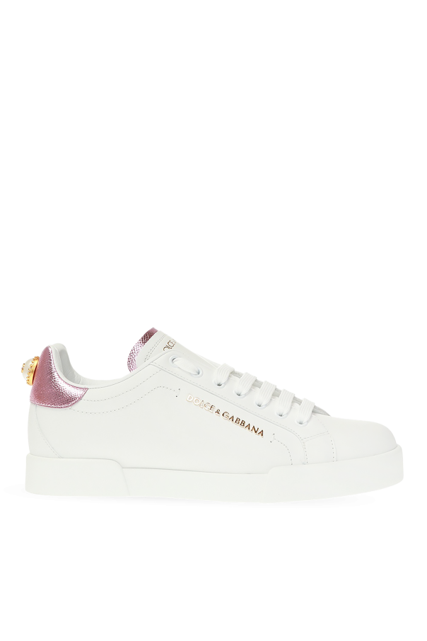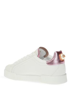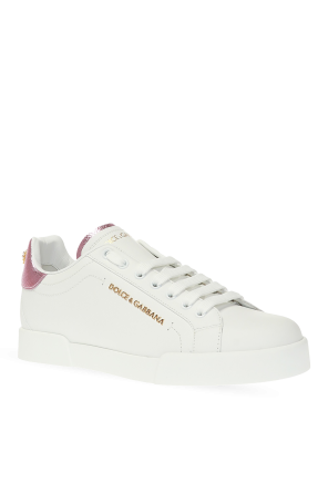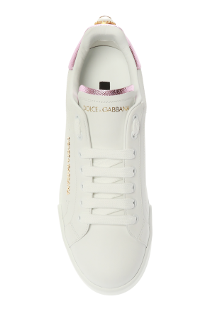 Dolce & Gabbana的白色Portofino系带运动鞋,饰以带金色logo细节的粉色纹理元素。白色橡胶鞋底。