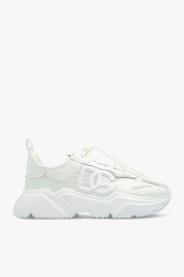 White ‘Daymaster’ sneakers from Dolce & Gabbana. Crafted from leather, this lace-up model sits on a white rubber sole and showcases the brand's logo, rubber inserts and fabric overlays.