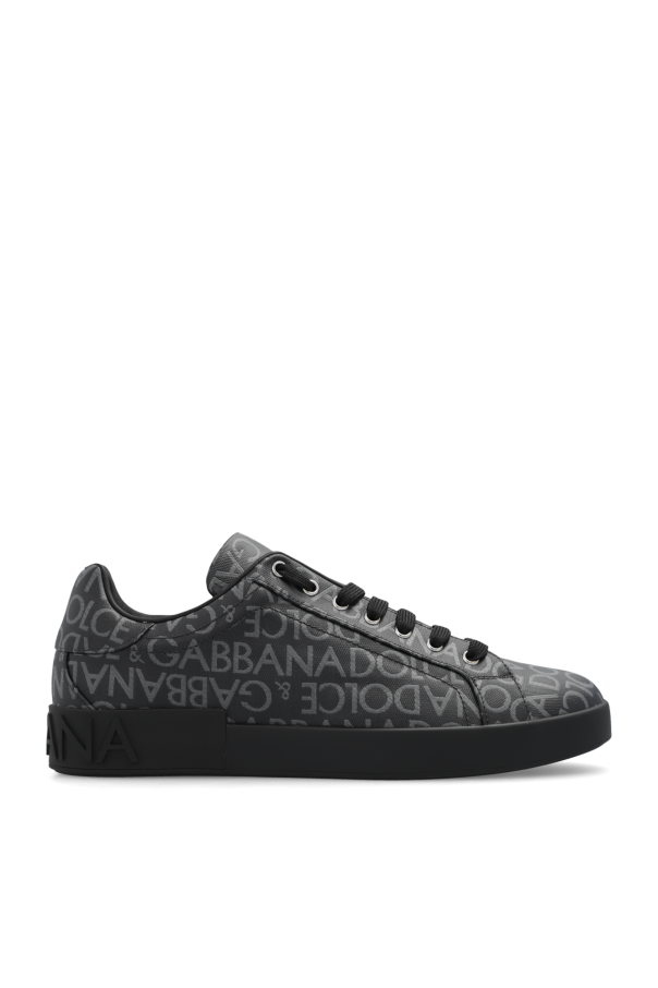 Black and grey ‘Portofino’ sneakers from Dolce & Gabbana. Crafted from coated canvas, this lace-up model sits on a black rubber sole and showcases a logo pattern and tactile branding at the back.