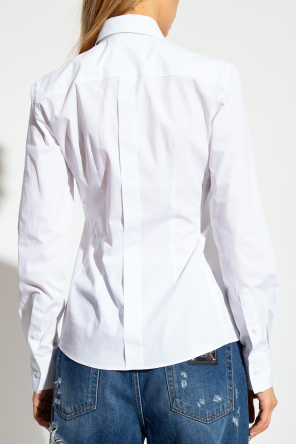 Dolce & Gabbana的白色衬衫,采用棉质面料制成,贴身设计,纽扣开合,领口为立领,长袖配有纽扣袖口。