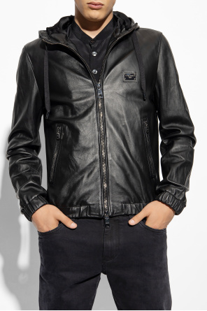 Black jacket from Dolce & Gabbana. Made of lamb leather, this long sleeve design features a two-way zip, drawstring hood, logo-engraved patch in black and silver-tone, two zip pockets and ribbed trims at the hem and cuffs.