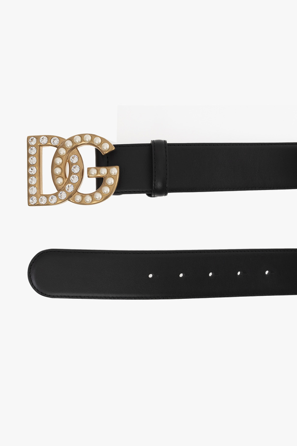 Dolce & Gabbana 的黑腰带。由小牛皮材质制成,金色金属搭扣饰有亮面水晶和珍珠细节。