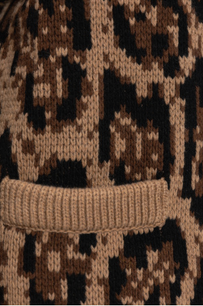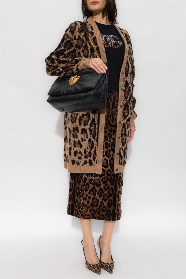 Dolce & Gabbana 的棕色和黑色开衫,采用羊绒和羊毛混纺面料制成,饰有提花豹纹图案,配有 V 领、按扣、长袖和罗纹边。