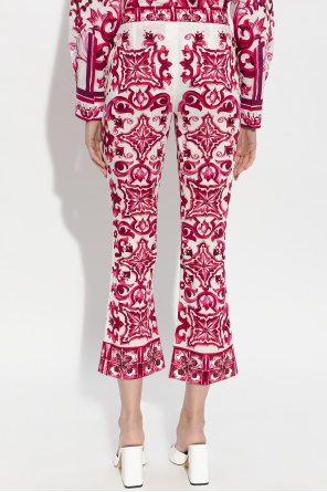 Dolce & Gabbana的粉白色裤子。采用丝绸制成。侧面采用隐藏式拉链开合。饰有地中海风格的植物图案,灵感来自马约利卡陶瓷。阔腿设计。长裤腿。
