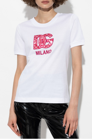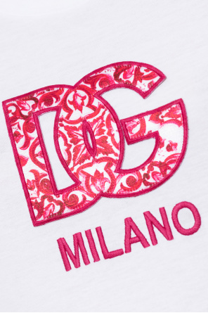 Dolce & Gabbana 的白色圆领T恤,短袖,采用棉质精制而成,饰有粉色徽标贴片。
