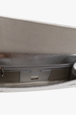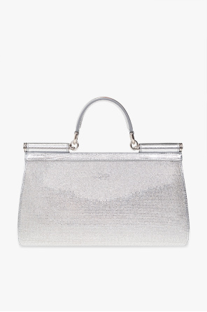Silver-tone ‘Sicily’ shoulder bag from Dolce & Gabbana x Kim. Crafted from material with all-over rhinestones and trimmed with lizard skin-effect leather, this design fastens with snaps and showcases a logo-engraved application on the front. It is complete with a half-round handle, a detachable and adjustable shoulder strap, silver-tone metal hardware and one internal compartment with one slip pocket, one zip pocket and one card slot.