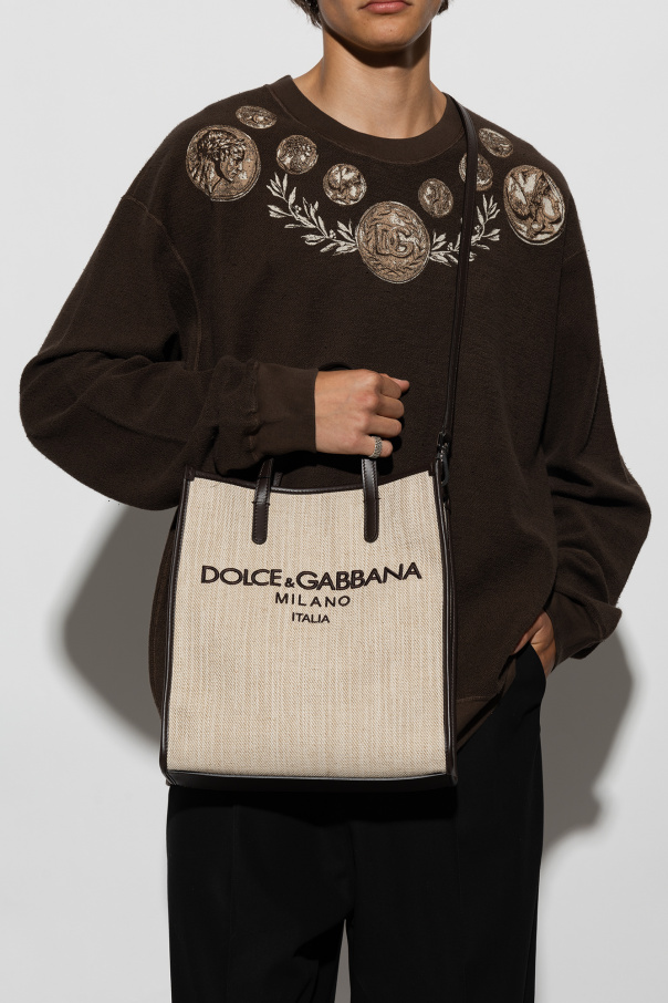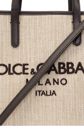 Beige shopper bag from Dolce & Gabbana. Crafted from linen and cotton canvas with brown leather trims, this model fastens with a snap closure and is decorated with a logo embroidery. It is complete with two half-round handles, a detachable and adjustable shoulder strap, silver-tone metal hardware and one internal compartment with one zip pocket.