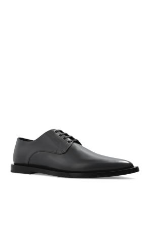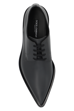 Grey derby shoes from Dolce & Gabbana. Made of patent leather, this lace-up pair features a pointed toe and black rubber-trimmed leather sole.