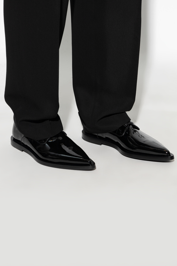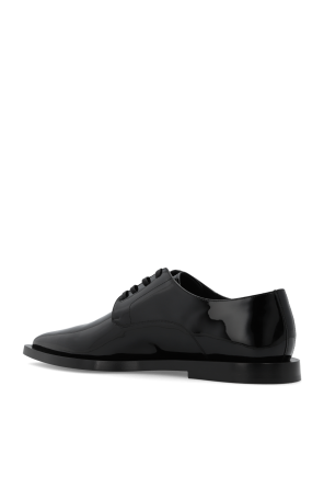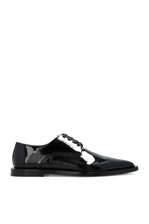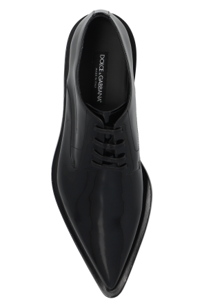 Black derby shoes from Dolce & Gabbana. Made of patent leather, this lace-up pair features a pointed toe and black rubber-trimmed leather sole.