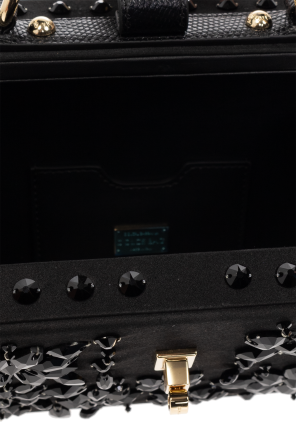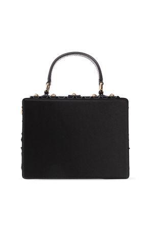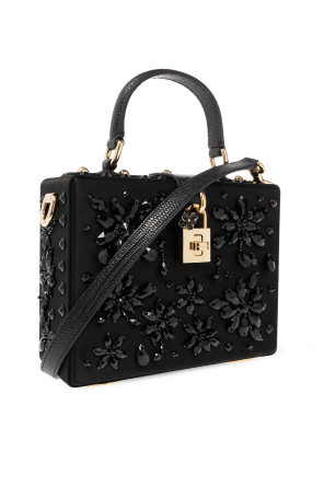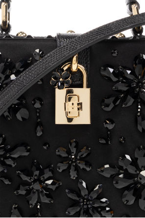 Black, square shoulder bag with a satin finish from Dolce & Gabbana. Trimmed with leather, this design features a padlock twist closure engraved with a logo, crystals, half-round handle, detachable and adjustable strap, one internal compartment and gold-tone metal hardware.