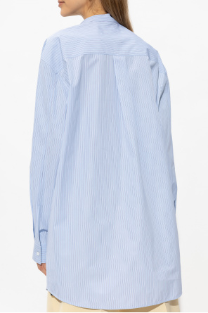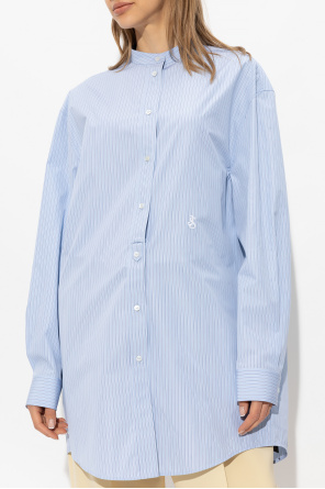 JIL SANDER 蓝色棉质小高领衬衫。宽松店,纽扣开合,细条纹图案,正面饰有白色徽标刺绣,长袖配有纽扣袖口。