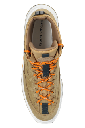 Beige, green and orange ‘Journey Lite’ boots from Canada Goose. Made of leather and water-resistant fabric, this lace-up pair sits on a white, orange and beige rubber tread sole and features an embossed logo and perforations on the sides.