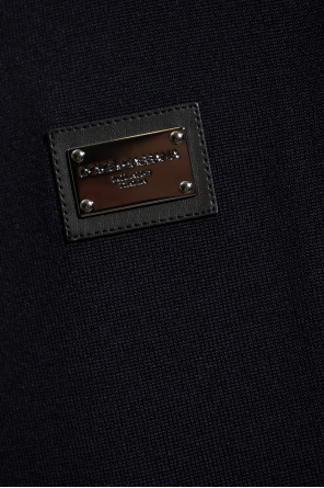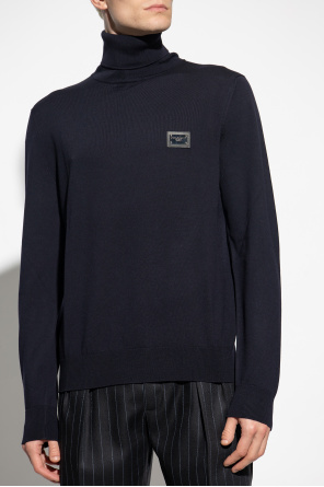 Navy blue turtleneck sweater from Dolce & Gabbana. Made of virgin wool, this style features a snug collar, long sleeves, ribbed trims on the bottom hem and cuffs and a silver-tone metal logo plaque on the front.