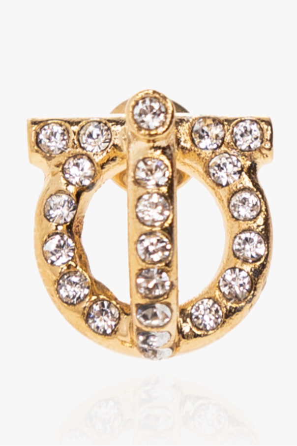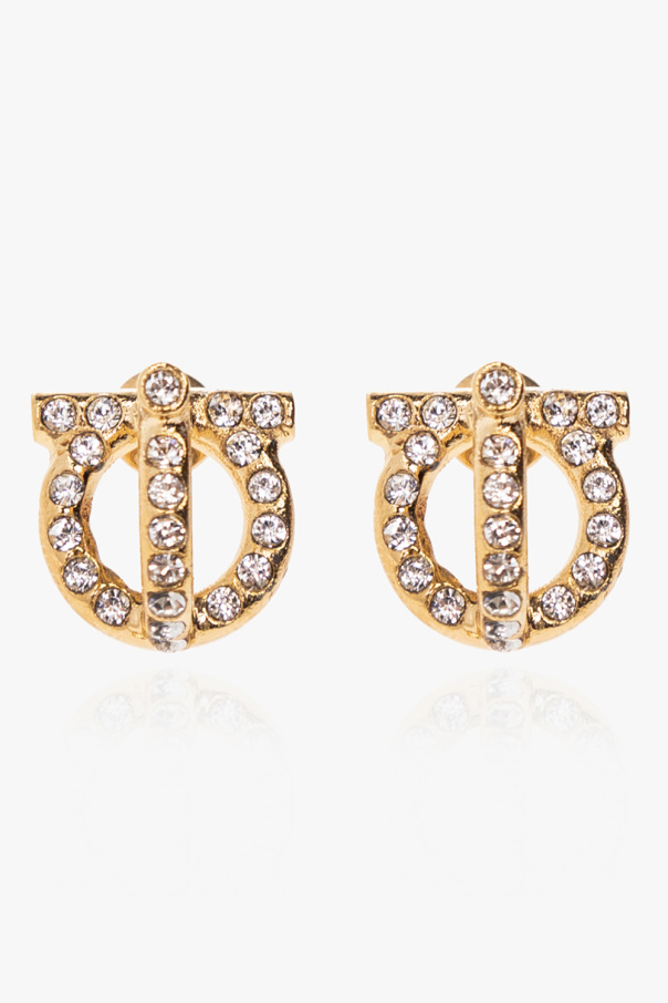 Gold-tone, logo-shaped push-back earrings from FERRAGAMO. Crafted from brass, this pair is embellished with crystals.