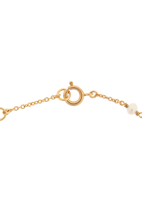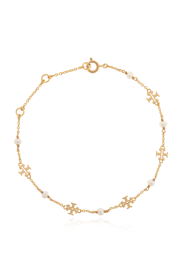 Gold-tone ‘Kira’ bracelet from Tory Burch. Made of brass, this item features logo applications, pearl embellishments and a lobster clasp fastening.