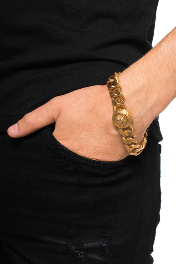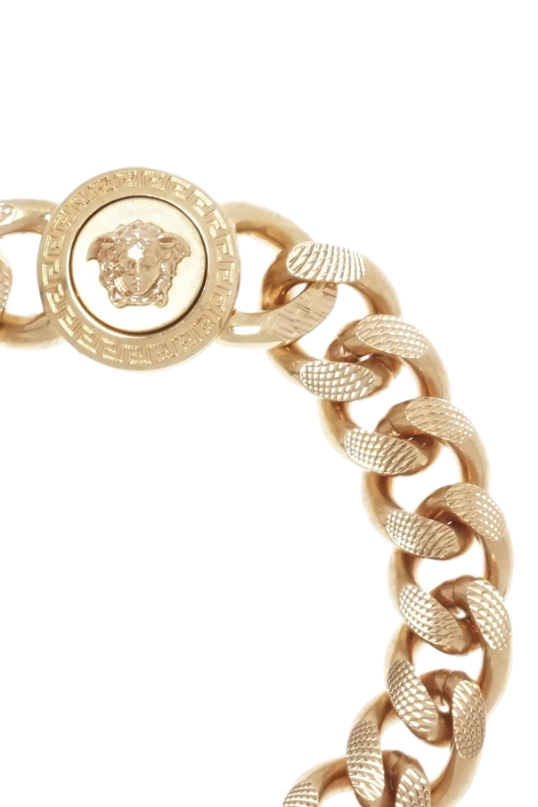 Versace的金色金属手镯。附按扣。附含希腊风格图案的Medusa头饰。