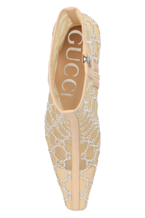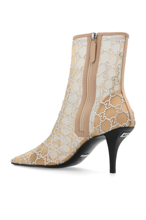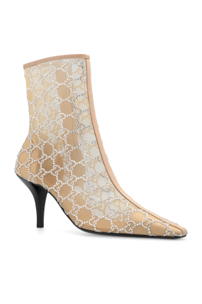 Gucci的奶油色高跟靴子。采用透明网眼面料制成,饰有镶有光面水晶的‘GG’标志。饰有皮革细节。侧面拉链开合。方头设计。黑色高跟。黑色皮革鞋底。