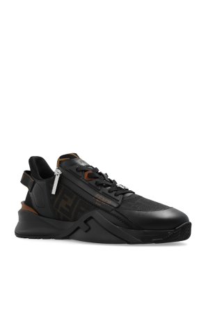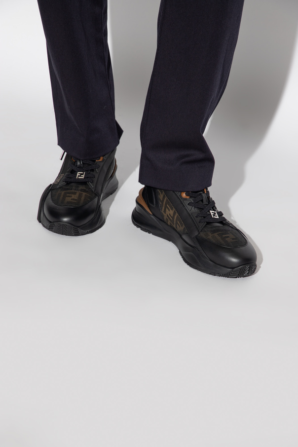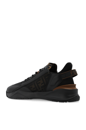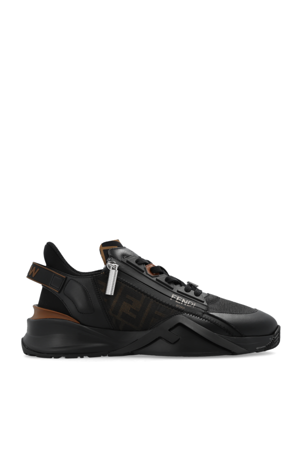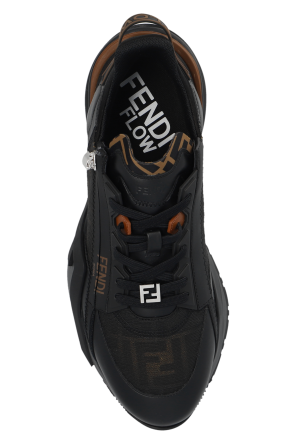 Fendi的黑棕色运动鞋,系带设计。采用皮革和面料制成。饰有字母图案。侧面带有拉链开合。黑色橡胶鞋底。