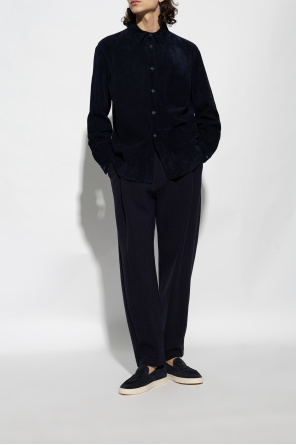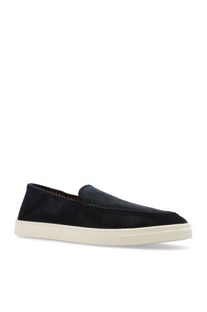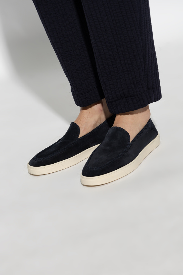 Giorgio Armani的深蓝穿套式鞋,采用绒面皮制成,饰以缝线。奶油色橡胶鞋底搭配凸起标志。