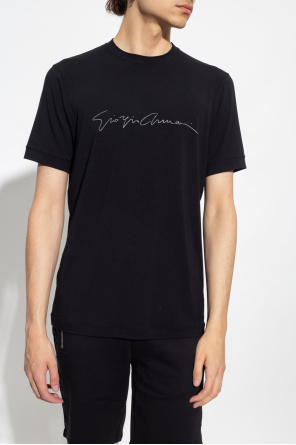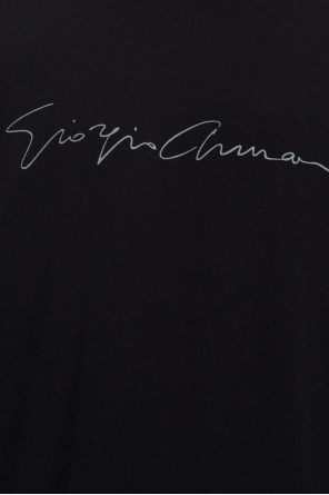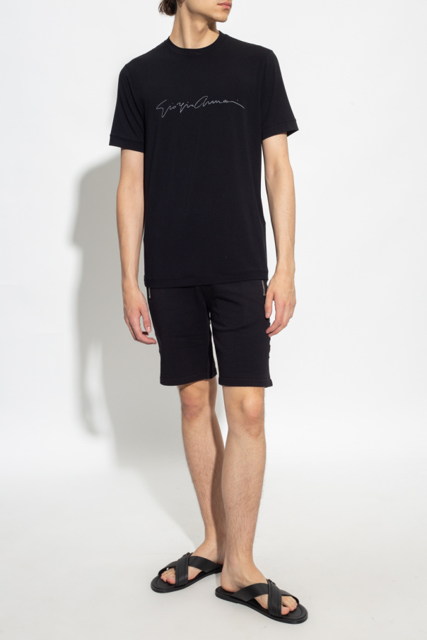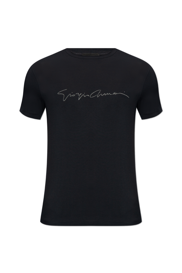 Giorgio Armani的黑色棉质圆领T恤。 短袖,松紧衣领,灰色的品牌标志图案。
