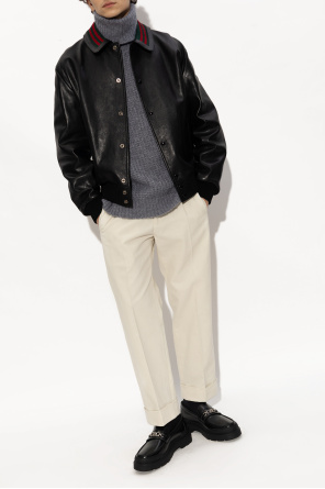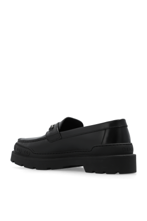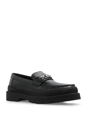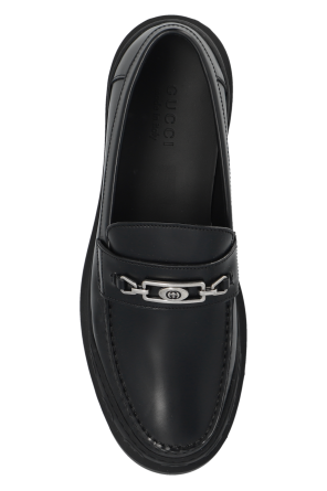 Gucci的黑色皮质乐福鞋。前部饰有银色金属‘Interlocking G’标志细节。黑色橡胶鞋底。