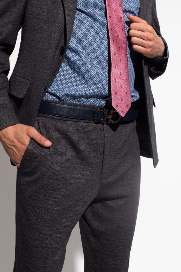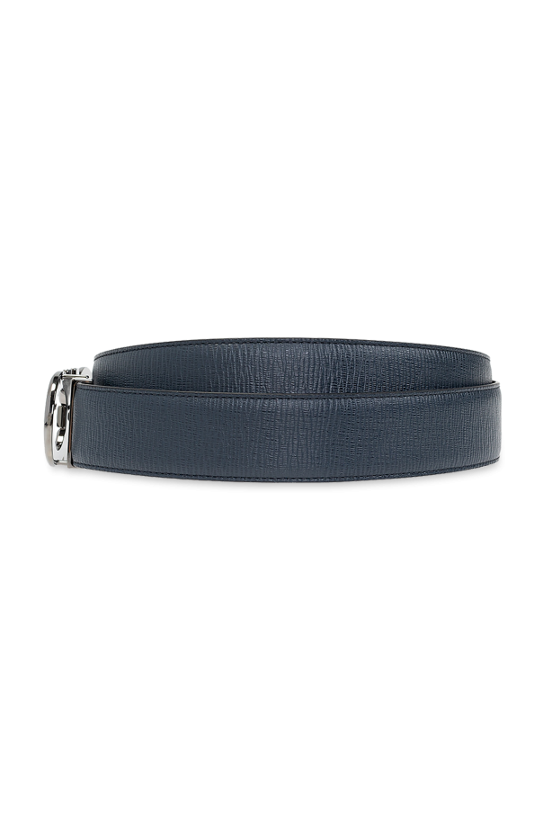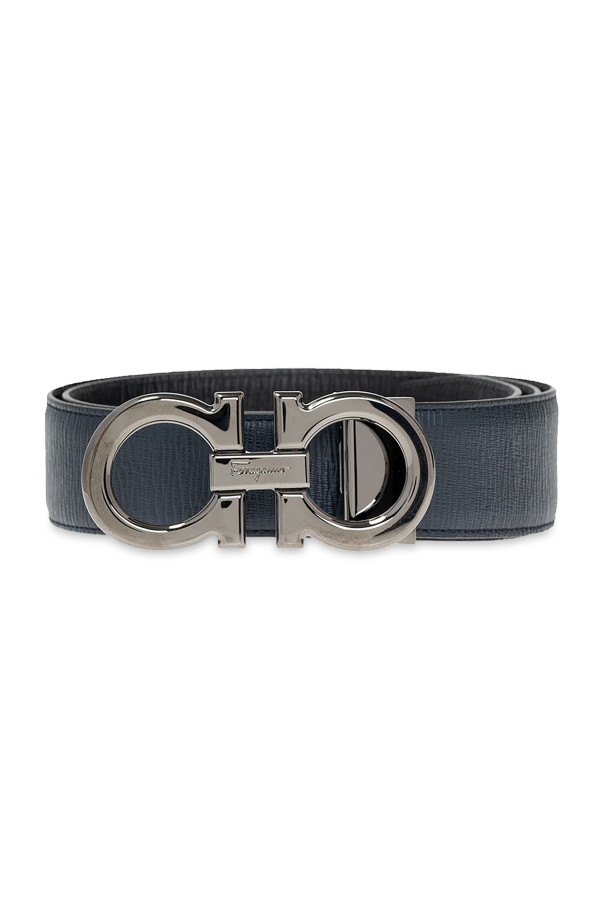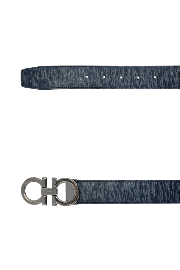 Salvatore Ferragamo的黑色和深蓝双面腰带,采用小牛皮制成。灰色金属logo搭扣。