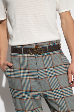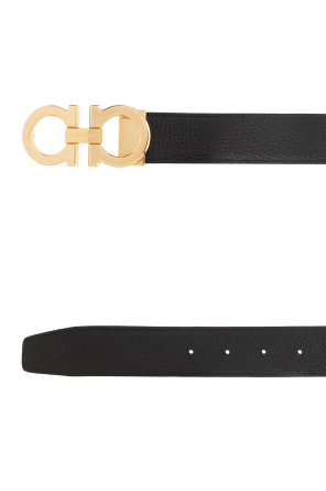 Reversible belt in brown and black from FERRAGAMO. Made of calf leather, this item showcases an embossed ‘Gancini’ pattern and a gold-tone buckle closure.