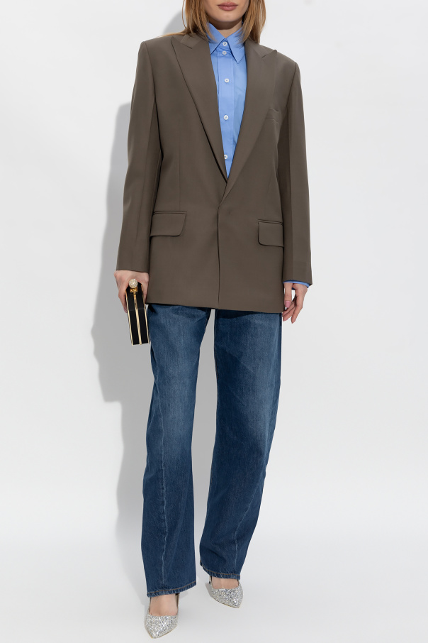 Victoria Beckham的宽松款蓝色衬衫。采用有机棉制成。纽扣开合。正面饰有红色刺绣标志和一个插袋。长袖,纽扣袖口。