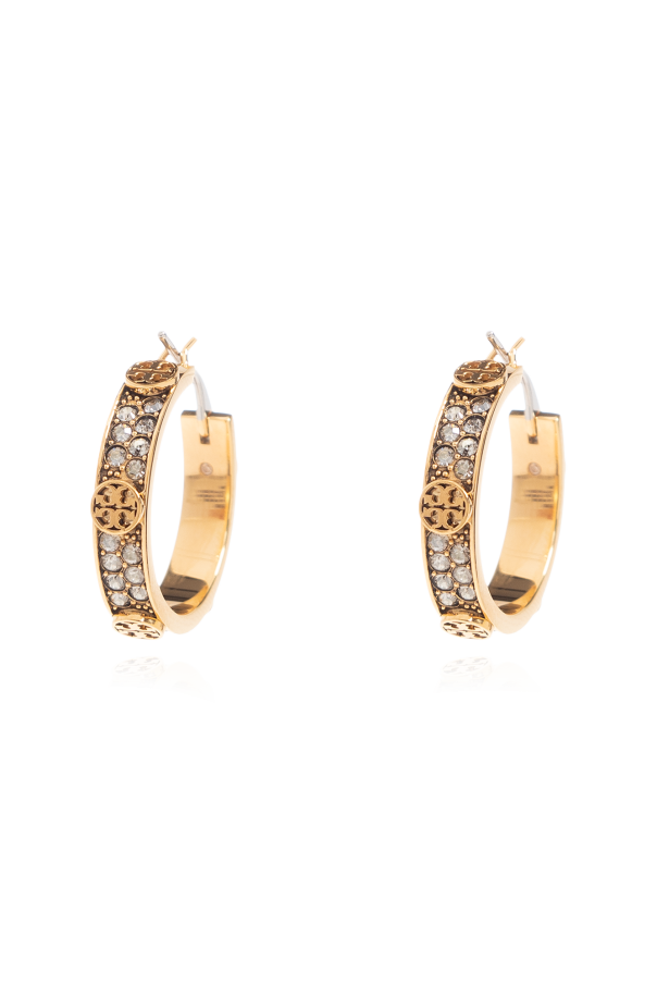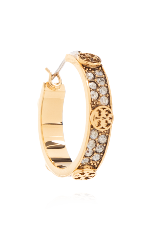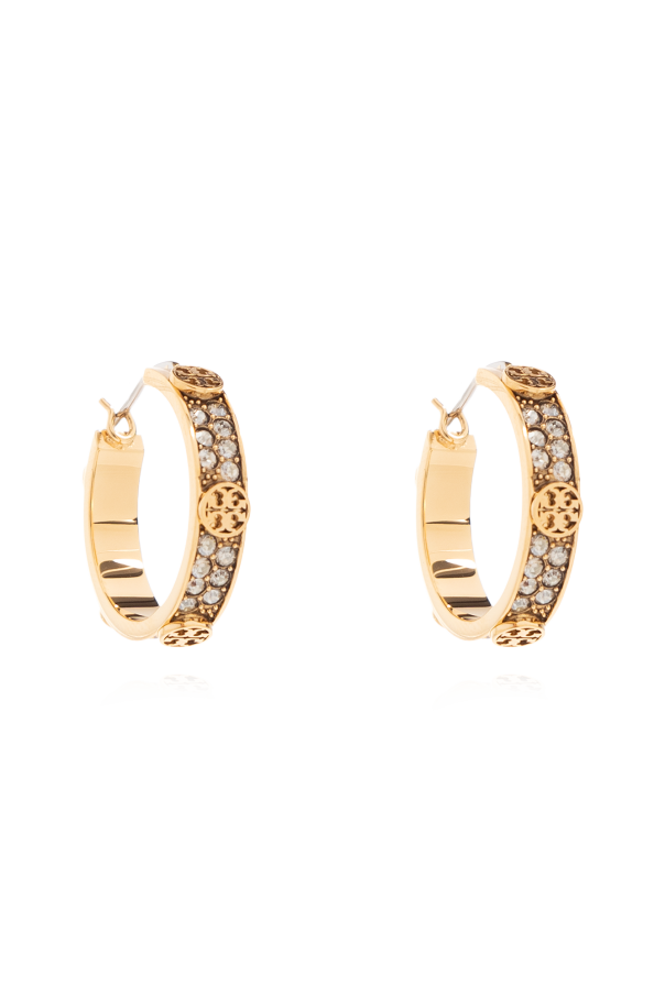 Tory Burch的黄色黄铜Miller Small耳环,圆形设计。饰有品牌标志。镶有闪亮水晶。
