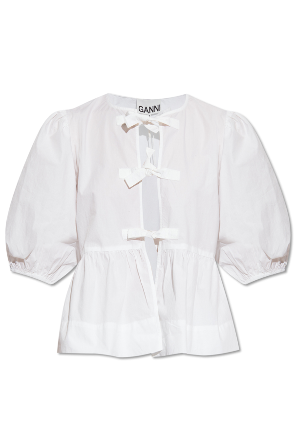 Ganni的白色宽松上衣,采用有机棉制成。前部系带设计。圆领。松紧袖口的短泡泡袖。底部饰以荷叶边。