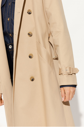 Beige trench coat from A.P.C. Crafted from cotton, this style features a double-breasted silhouette with buttons, a waist-cinching buckle belt, two slip pockets, a single back vent and long sleeves with buckle adjusters.